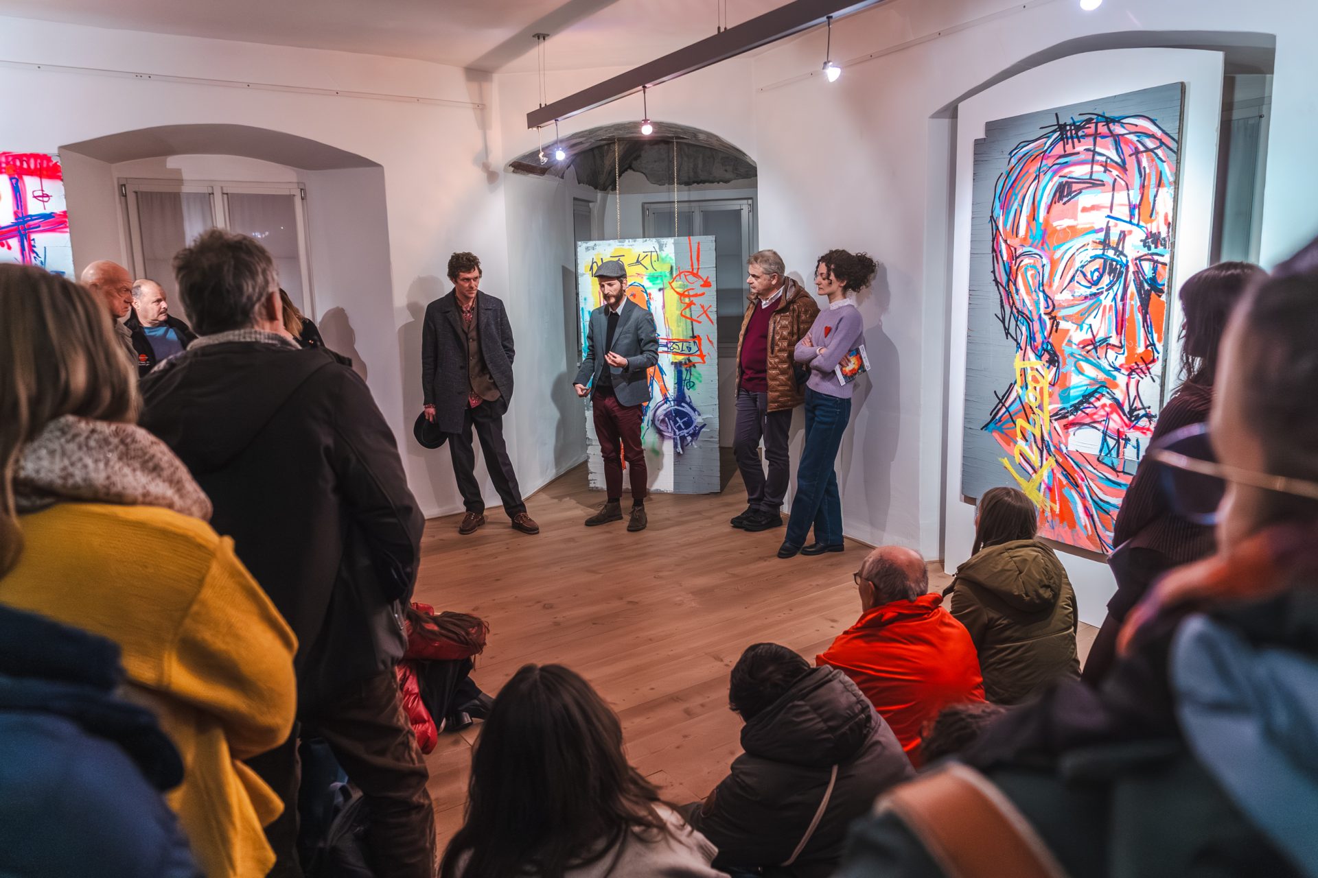 Il pittore e musicista Peter Burchia è nato a Bolzano nel 1994. Autodidatta, Burchia inizia a dipingere sin dall’infanzia, avvicinandosi parallelamente alla musica folk, praticata come solista e come membro di vari gruppi. La sua produzione pittorica, che dialoga con una costellazione che vede accostarsi in una declinazione originale stimoli provenienti dall’ambito dell’Espressionismo, del Surrealismo e della Graffiti Art, si contraddistingue per un linguaggio fatto di grafismi taglienti, lettere, ideogrammi, sigle testuali, numeriche e ideografiche, deformazioni figurali, vivaci contrasti di colore e accostamenti di tecniche e materiali i più variegati. Vero e proprio animatore artistico e culturale del territorio altoatesino, Burchia ha partecipato a una serie di mostre collettive e personali e dal 2024 è presentato dalla Loft 11 Gallery di Monaco di Baviera.