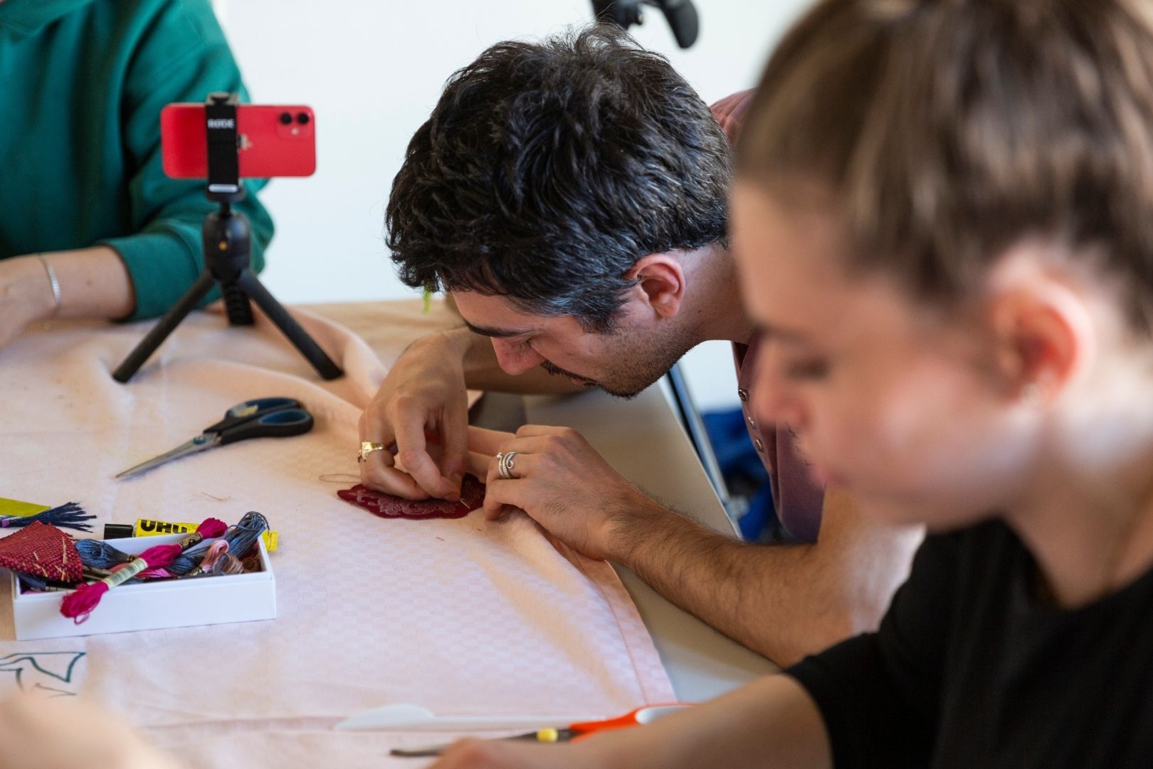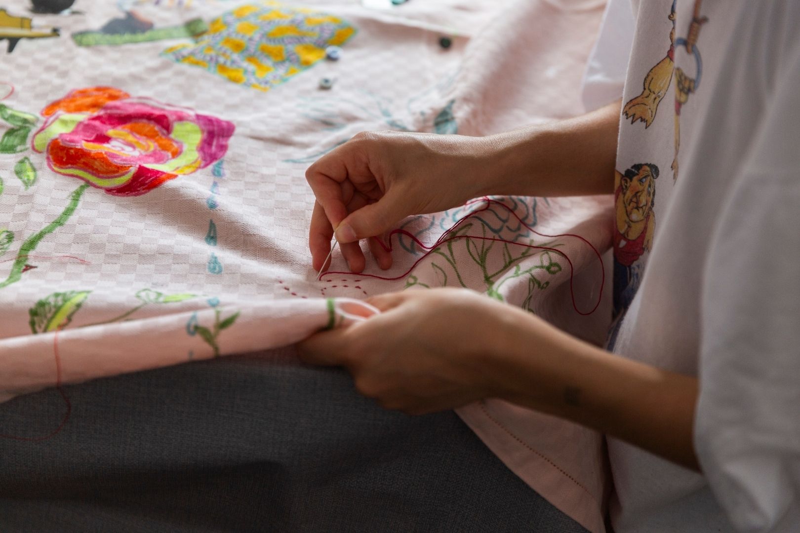 “Corpi Tessuti” di Daria Akimenko è un percorso di esplorazione della presenza, della memoria e della connessione attraverso il tessuto che, come i corpi, ha vissuto storie, porta tracce del tempo e custodisce narrazioni silenziose. Tessuti scartati, usati e trasformati, sono stati intrecciati in nuove storie condivise attraverso il ricamo, il collage e la pittura.